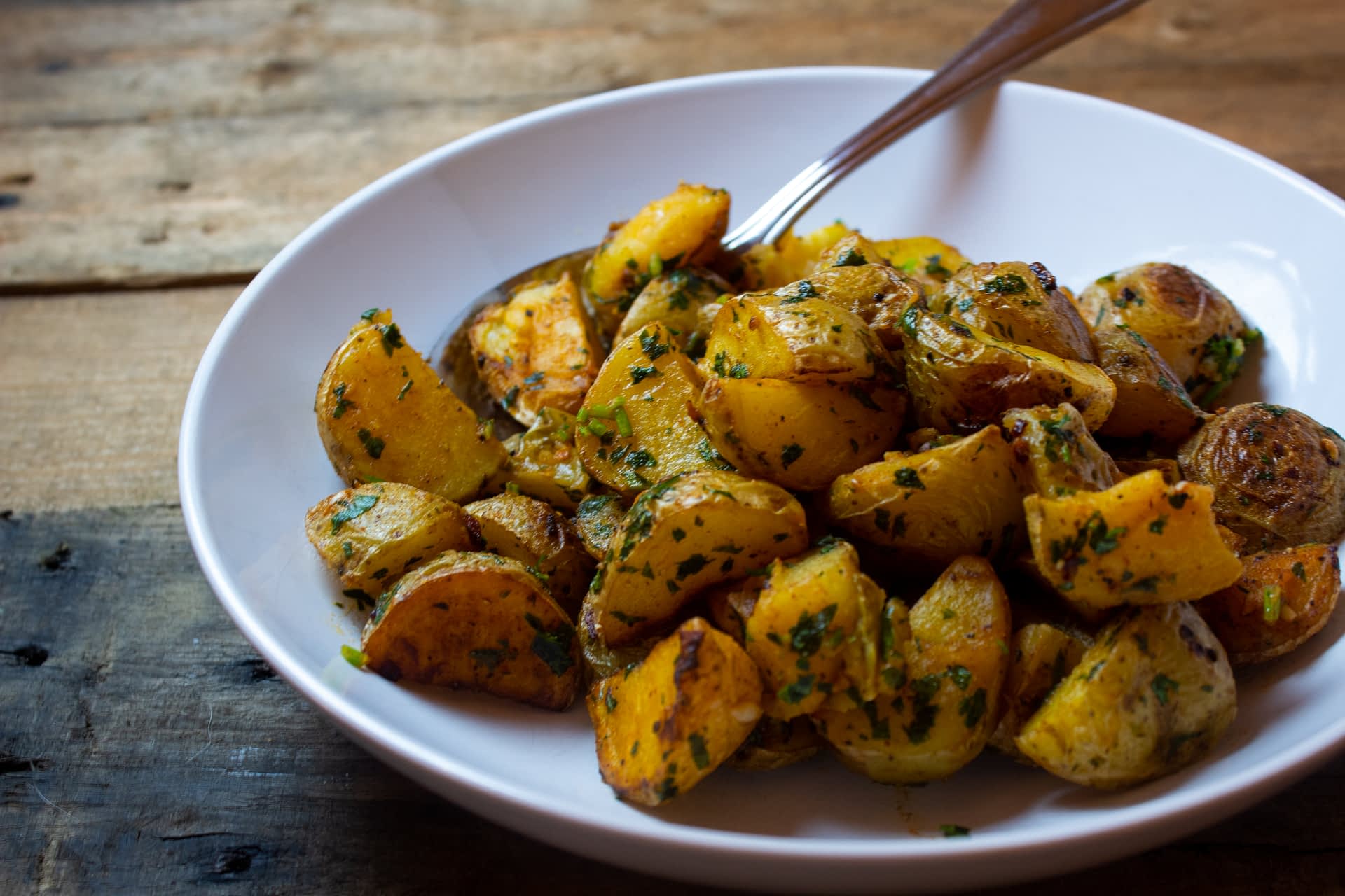 - Tempere: Coloque as batatas em uma forma, regue com azeite extra virgem, sal, pimenta e as ervas frescas picadas. Se desejar, adicione um pouco de alho em pó para realçar o sabor.