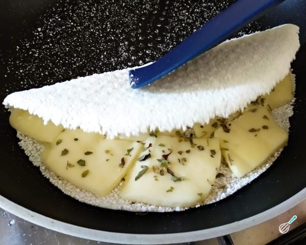 - Feche a Tapioca: Dobre a tapioca ao meio, formando uma meia-lua. Pressione levemente com uma espátula para ajudar a derreter o queijo e unir bem as bordas, garantindo que o recheio fique bem selado dentro.